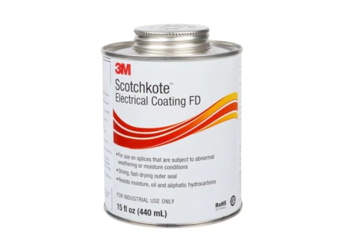 3M Scotchkote Electrical Coating FD is designed to use with Scotch Vinyl Electrical Tapes. It is ideal for use in applications that are subjected to excessive amounts of moisture and oil.